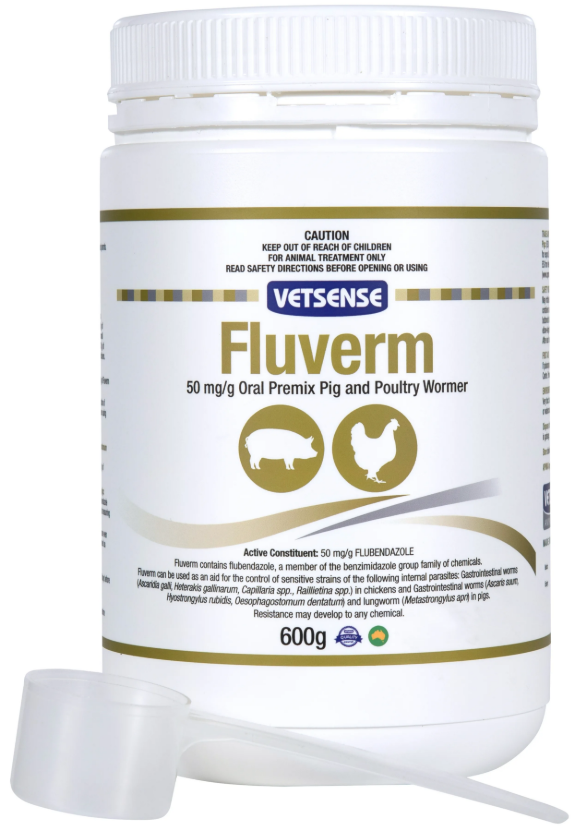 Fluverm is an in-feed powdered wormer used to aid and control sensitive strains of internal parasites in pigs and poultry.