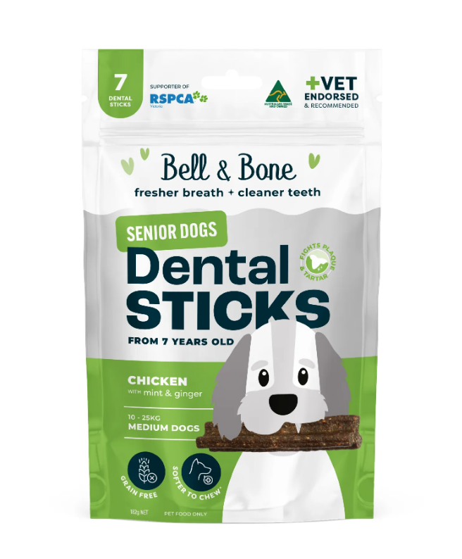 Bell & Bone’s Senior Chicken, Mint, and Ginger Dental Sticks have been developed specifically to support your senior dog’s oral care and overall well-being as they journey through their mature years. Fighting plaque and tartar build-up with their unique 3-pronged shape, these dental sticks are a softer chew tailored for senior dogs, encouraging gentle chewing and abrasion, and with the support of active ingredients.